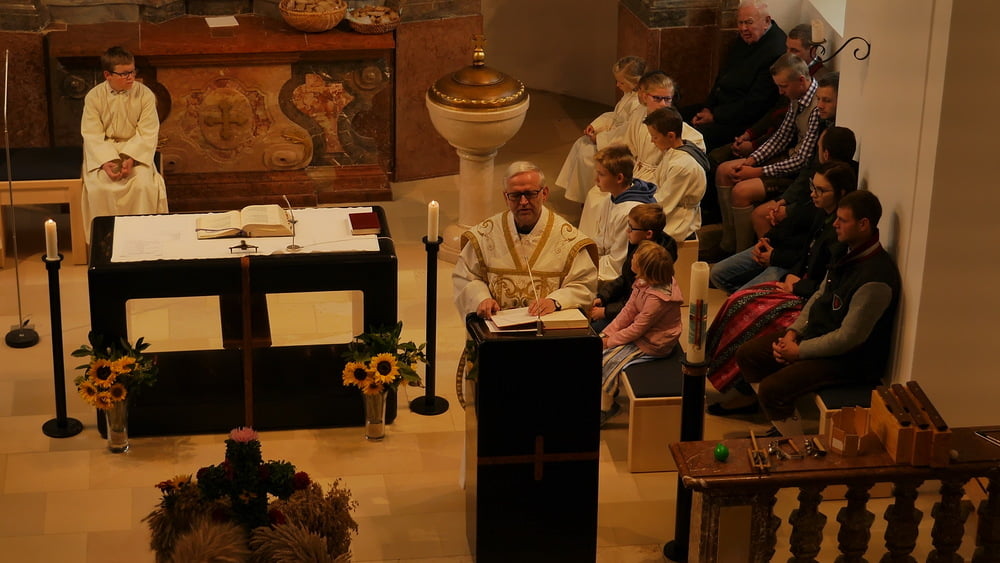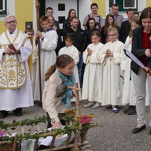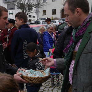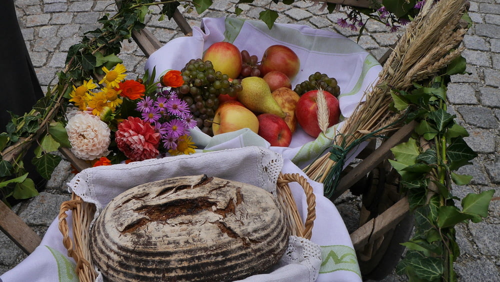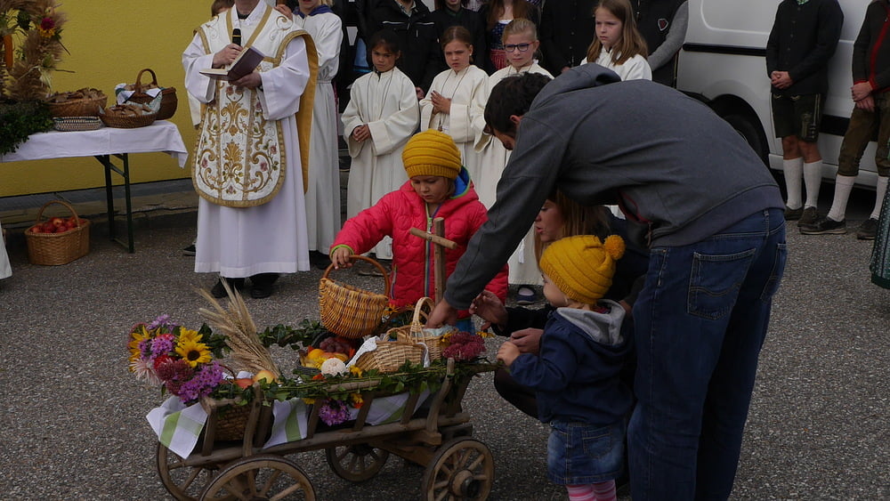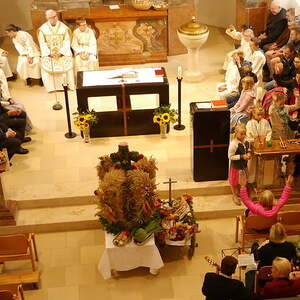 Nach der Kommunion nahm die Religionslehrerin die Mitfeiernden mit auf den Weg des Samens: Zur Aussaat, zum Warten auf Regen und Sonne, zum Keimen und Reifen. Die Geschichte wurde von den Schülerinnen und Schülern mit Klanginstrumenten untermalt. Mit den Liedern „Gottes Gaben sind so wunderbar“ und „Großer Gott wir loben dich“ fand der Dankgottesdienst einen feierlichen Abschluss. Am Kirchenplatz wurden die gesegneten Brote und Früchte verteilt und gemeinsam gegessen.