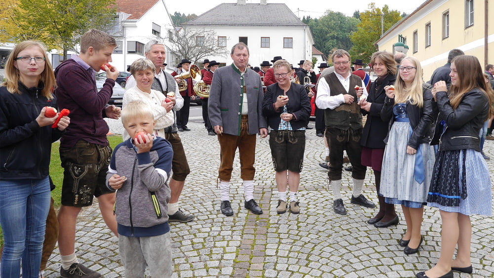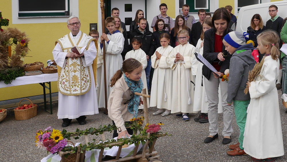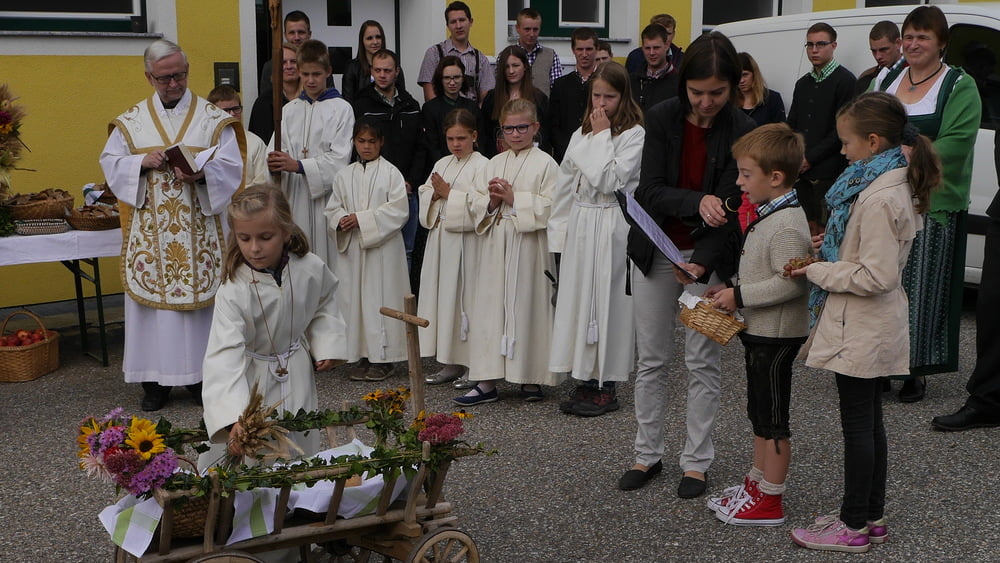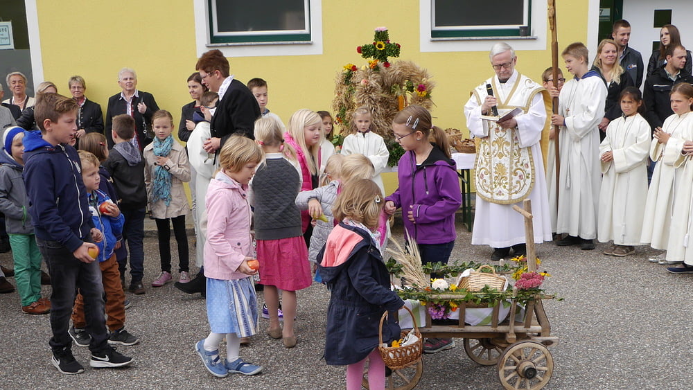 Nach einer stimmungsvollen Besinnung brachten die Schüler ihre Gaben und alle Kinder, die Früchte mitgebracht hatten, befüllten den Erntewagen. Nach der Segnung der Früchte und der Erntekrone, die von der Landjugend gebunden und geschmückt wurde, zog die Pfarrgemeinde mit den Klängen des Musikvereines Eidenberg in die Kirche ein, wo die Messe gefeiert wurde.