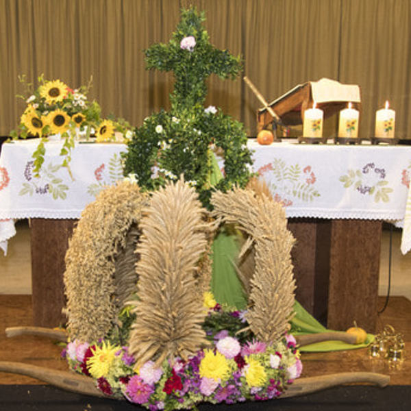 Pfarrer Maximilian betonte den Unterschied zwischen einem Erntefest und einem Erntedankfest. Anhand der Symbole Kochbuch, Herz und Sonnenblume erläuterte Maximilian den Sinn des Dankens.